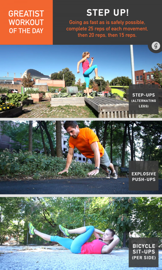 Want to kick up the intensity? Hold light kettlebells or dumbbells in both hands on the step-ups. And don't forget to check back tomorrow for a totally new (but equally awesome) GWOD!